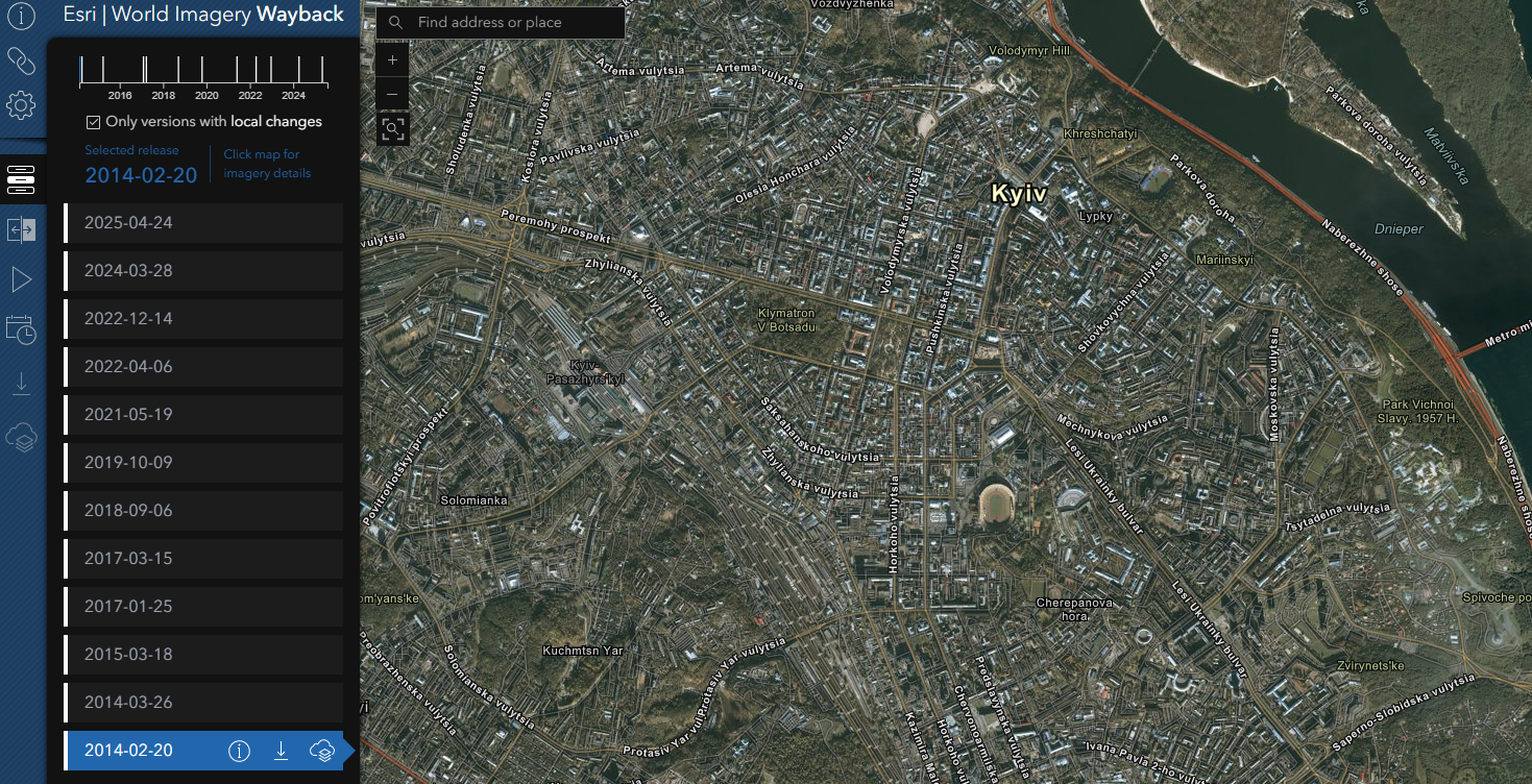 Поверне вас назад у часі, зможете проаналізувати як змінилася конкретна місцевість за 10 років. Наприклад, зміни клімату в Гренландії або наслідки «руского міра» для Маріуполя. Також, у деяких випадках, підійде для визначення проміжку часу, коли було зроблено фото чи відео.