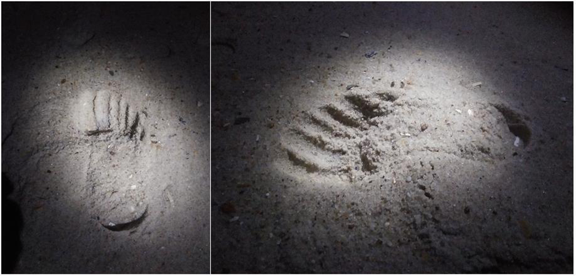Странности, которые случались с исследователями, не ограничивались надзором со стороны НЛО и миниатюрных шариков. В 1.30 ночи в сентябре 2022 г. трое исследователей увидели на пляже непонятные следы. Они начинались на совершенно пустом месте и шли к воде. Следы напоминали отпечатки босых ног, но имели шесть пальцев и другие отличия от обычных человеческих стоп. Судя по термограмме, сделанной инфракрасной камерой, следы оставило теплокровное существо всего несколько минут назад. Исследователи уверяют, что в это время никто, кроме них, не мог находиться на пляже в охраняемом заказнике. Шаг следов составлял 29 дюймов (73 см), гораздо больше, чем у любого из них. Джеральд измерил свой шаг — он составлял всего 21 дюйм (53 см).