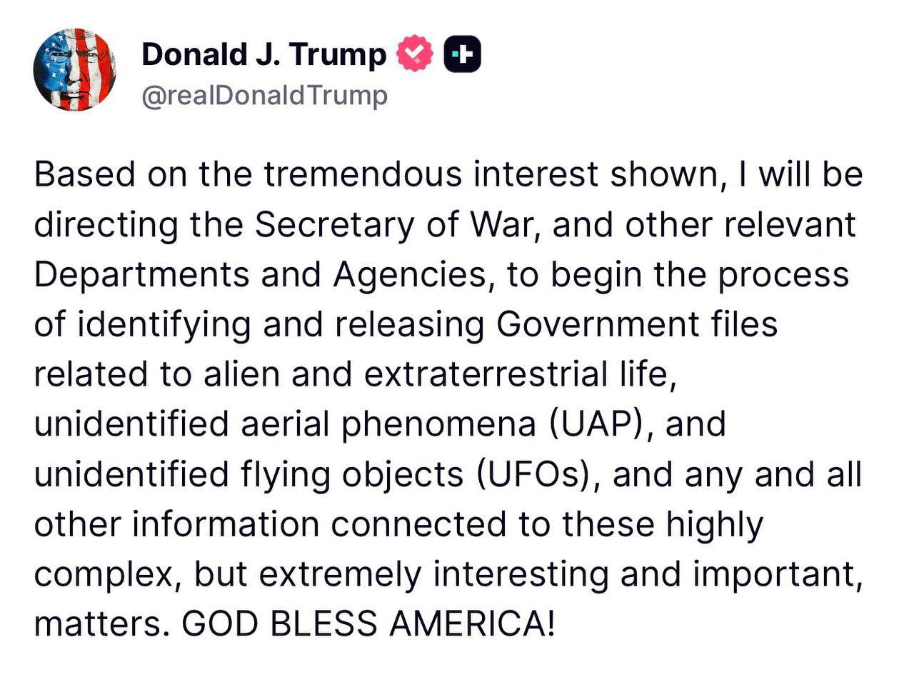 Цю тему «підхопив» діючий президент США Дональд Трамп, який у своїй соцмережі оголосив, що доручив Пентагону та іншим відомствам підготуватися до оприлюднення всіх урядових матеріалів про НЛО та позаземне життя. Трамп пояснив: «Враховуючи величезний інтерес до цього питання, я доручу Міністру оборони та відповідним департаментам і відомствам розпочати процес виявлення і оприлюднення урядових файлів, що стосуються інопланетного та позаземного життя, непізнаних повітряних явищ (UAP) та непізнаних літаючих об’єктів (UFO), і будь-якої іншої інформації, пов’язаної з цими складними, але важливими питаннями.». У спілкуванні з журналістами він також висловив критику на адресу Обами, стверджуючи, що той **«зробив велику помилку», можливо розголосивши секретну інформацію». Він сам при цьому визнав, що не має твердого власного переконання щодо реальності прибульців