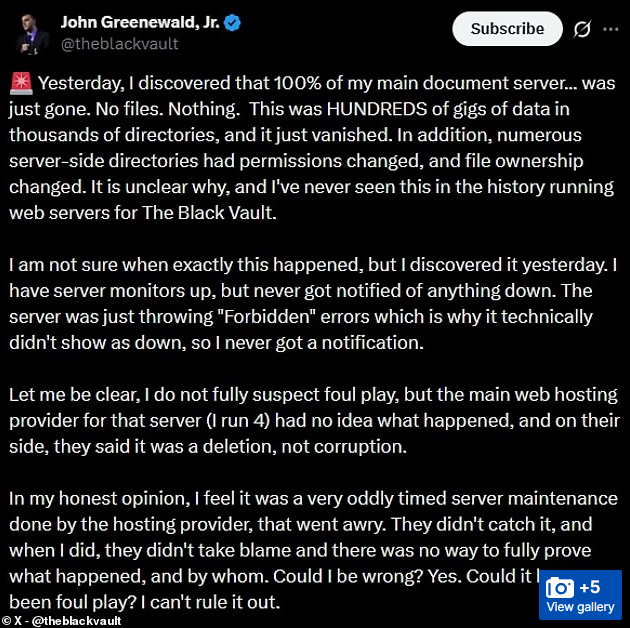 Додаткового резонансу темі надала публікація британського таблоїда Daily Mail про нібито «зникнення» великого онлайн-архіву документів про НЛО — The Black Vault. Йдеться про приватний архів дослідника Джона Гріневальда-молодшого, який десятиліттями публікує розсекречені матеріали, отримані через механізм FOIA. Після заяв Дональда Трампа про можливе оприлюднення нових даних частина серверних файлів архіву тимчасово стала недоступною, що спричинило хвилю припущень у соцмережах. Водночас власник ресурсу заявив, що дані зберігаються у резервних копіях, а ситуація може мати технічний, а не конспірологічний характер, одночасно отримати хайп для реклами свого ресурсу.